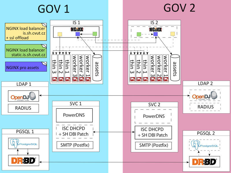 Serverový cluster je založený na nástroji Pacemaker. Hlavní linuxovou distribucí pro všechny servery byl použit Debian Wheezy.